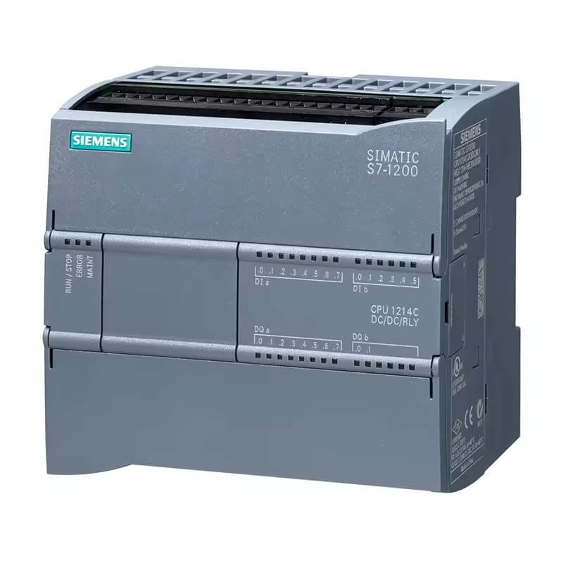 SIMATIC S7-1200, CPU 1214C, compact CPU, DC/DC/relay, onboard I/O: 14 DI 24 V DC; 10 DO relay 2 A; 2 AI 0-10 V DC, power supply: DC 20.4-28.8 V DC, program/data memory 150 KB.